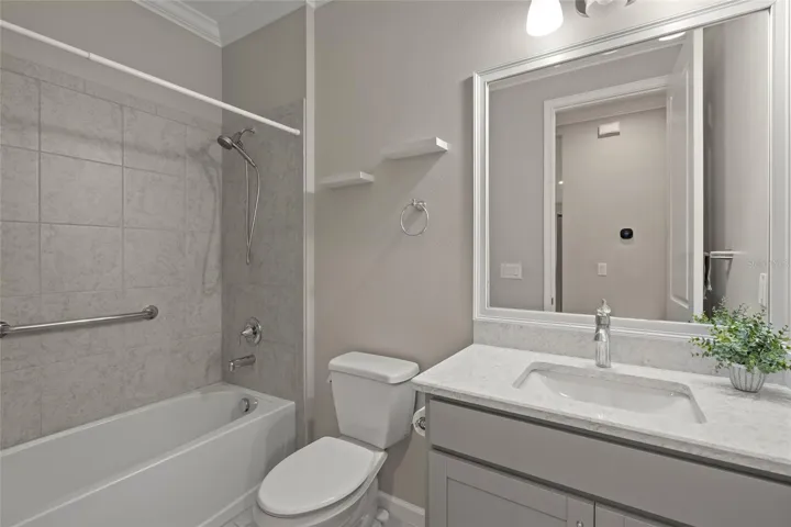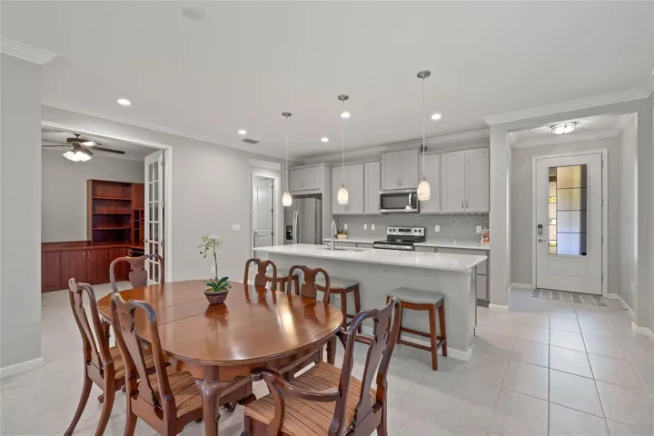 A welcoming front porch with retractable screen door provides wonderful airflow and leads to a gorgeous impact-glass front door. Inside, the open-concept layout is ideal for both everyday living and entertaining. The beautifully appointed kitchen showcases wood cabinetry, glass tile backsplash, quartz countertops, stainless steel appliances, and dimmable pendant lighting. The adjacent dining area comfortably accommodates a variety of table sizes and flows seamlessly into the spacious great room—perfect for gatherings.