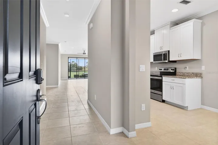 Inside, the home impresses with soaring ceilings, abundant natural light, crown molding, and tile flooring throughout the main living areas, creating a bright and airy ambiance. The expansive kitchen anchors the space with white shaker-style cabinetry, granite countertops, stainless steel appliances, a pantry, and generous storage, offering both elegance and functionality. A versatile adjacent area easily accommodates casual dining or a stylish home workspace.