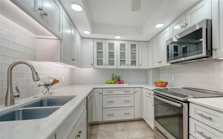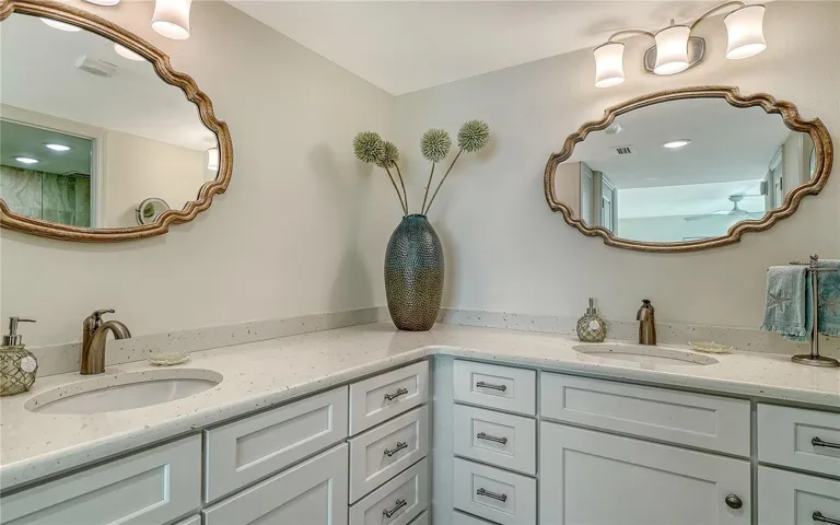 Inside, the light-filled, full Gulf-front layout includes two bedrooms with ensuite baths, a bonus room, and an open great room, dining room and kitchen. Thoughtful upgrades elevate the space, including solid-wood cabinetry, quartz countertops, impact glass windows and doors, in-unit washer/dryer, and remodeled kitchen and baths. This serene coastal residence presents with a fresh, move-in-ready feel.