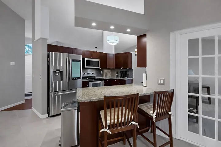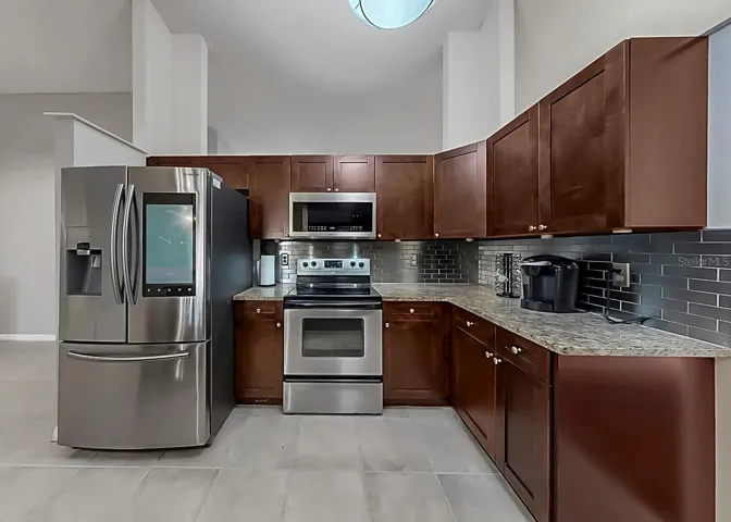 Inside, the kitchen features granite countertops, stainless steel appliances, a stylish backsplash, a smart refrigerator, along with a full appliance package including electric range, microwave, dishwasher, garbage disposal, washer, and dryer. Gorgeous light fixtures welcome you into the private primary suite, with two closets one being a walk-in closet, and quartz sinks, and a stunning stand-up shower.