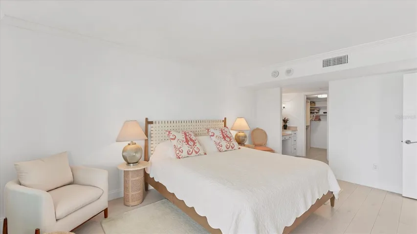 The pass-through kitchen enhances the open layout, allowing you to prepare meals and gather with guests while never losing sight of the water. The spacious great room is accented by white oak wood floors and elegant crown molding, beautifully framing the endless Gulf backdrop. The en-suite primary suite offers a walk-in closet and direct access to the expansive nearly 400-square-foot wraparound balcony, recently resurfaced with modern oversized tile—an idyllic setting for year-round sunset views. The inviting guest suite is also en-suite and includes its own walk-in closet.