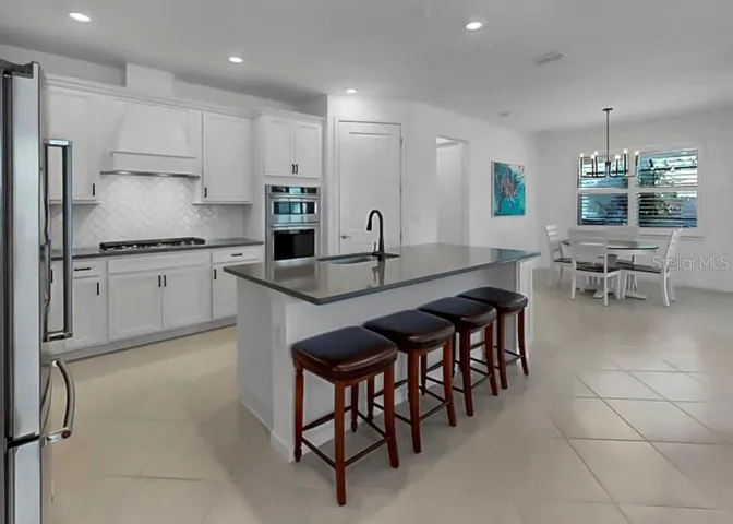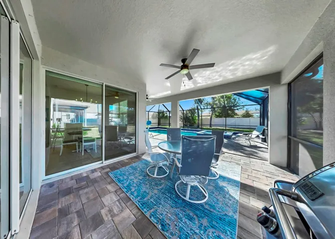 The private backyard retreat features an L shaped covered lanai leading to your private saltwater heated pool and spa. Pool features include tanning ledge, bubbler, pool light, and tiled surround. Complemented by brick pavers throughout and covered by screened enclosure — ideal for entertaining, relaxing, and enjoying Florida living year-round. Two separate sets of sliding glass doors, including a stacking pocket slider, provide dual entry points and create a seamless indoor-outdoor connection.