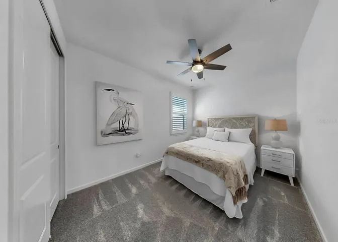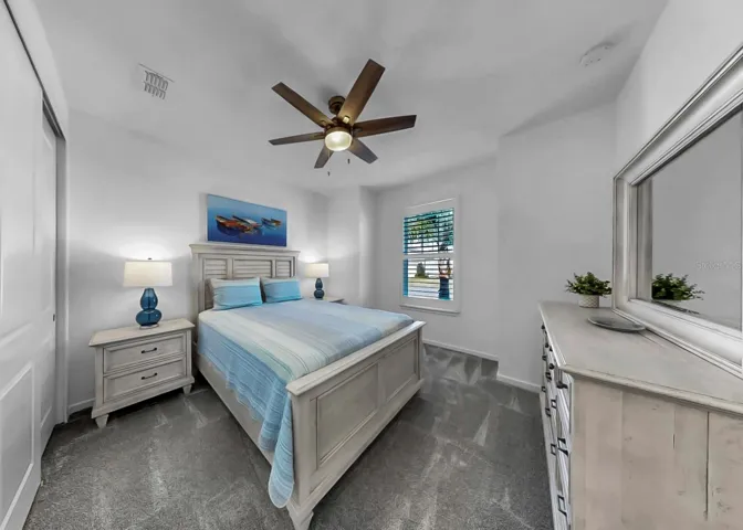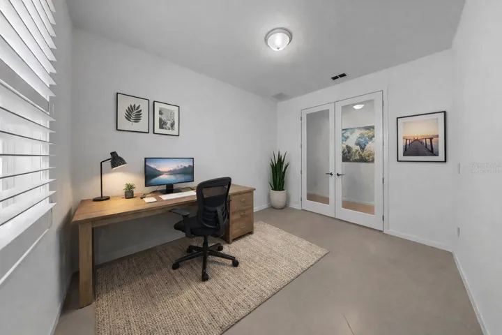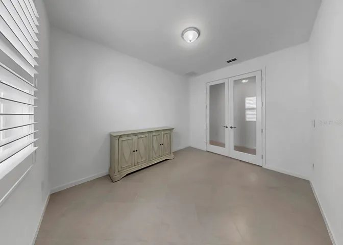 The spacious primary suite provides a relaxing escape, with a well-appointed en-suite bath featuring dual vanities, quartz countertops, a frameless glass shower, and walk in closet. The dedicated office is accented by glass-insert French-style doors, offering flexibility for remote work or a quiet retreat while maintaining natural light and an open feel. The split floor plan features two additional carpeted bedrooms separated from the primary suite. The secondary bathroom features tile surround tub/shower, quartz countertops, and a linen closet. A full size enclosed laundry room also features a utility sink.