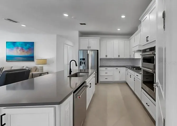 The chef’s kitchen is a true highlight packed with upgrades! Featuring quartz countertops, a large island with additional storage cabinetry, 42-inch upper cabinets with crown molding, soft-close cabinets and drawers, canopy hood, built-in KitchenAid appliances, a 36-inch five-burner gas range, herringbone pattern tiled backsplash, and a walk-in pantry. The kitchen opens directly to the main living area and dining area, making it ideal for entertaining.