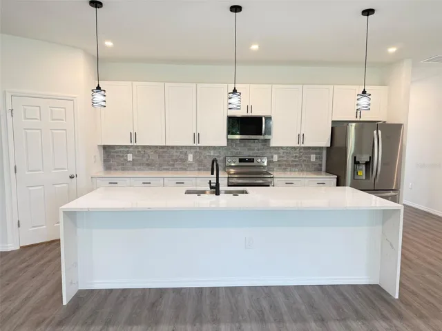 Exceptional four-bedroom, three-bath residence. This thoughtfully designed open-concept home maximizes space and natural light for effortless living. A welcoming foyer leads to a bright, spacious living area with expansive windows. The gourmet kitchen, equipped with premium appliances, a large center island, and abundant cabinetry, flows seamlessly into the dining and living spaces, ideal for entertaining or everyday family life. The main suite is a private retreat with a spa-inspired bath featuring a soaking tub, walk-in shower and dual vanities. Three additional generous size bedrooms provide accommodations for family or guests. Move-in ready and ideally balanced for comfort and style.