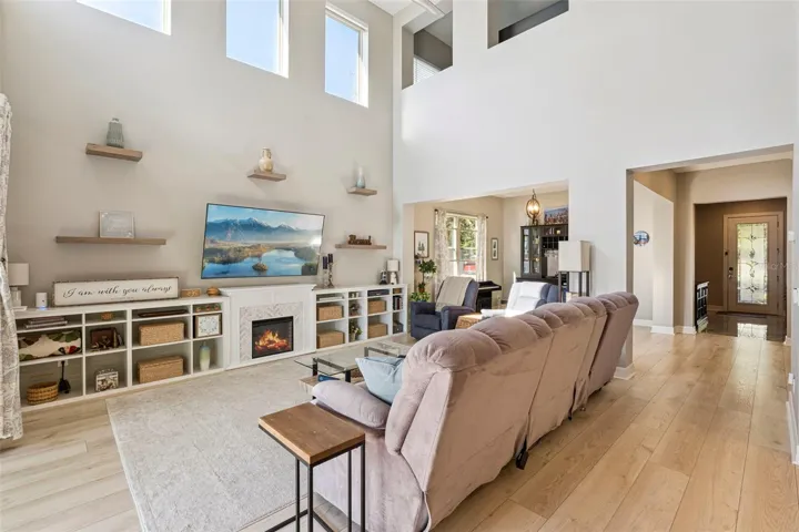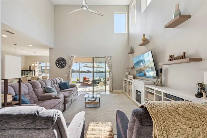 Located in the highly sought-after gated community of Ruby Lake, this exceptional lakefront residence offers resort-style living with access to a community pool, tennis courts, and fitness center—all set around the stunning waters of Lake Ruby. This 4-bedroom, 3.5-bath home has been thoughtfully updated and meticulously maintained, featuring fresh interior and exterior paint, new luxury laminate flooring throughout, and an abundance of natural light streaming through oversized windows. The open living room impresses with two-story coffered ceiling, large ceiling fan, automatic shades on upper windows, and a custom built-in entertainment center with fireplace. Triple-retracting sliding doors create seamless indoor/outdoor living, opening to an extended paver patio. A custom built-in is located in the large dining room, perfect to serve as a buffet or bar. The chef’s kitchen is truly a showstopper, boasting miles of quartz countertops, extensive white cabinetry, a 8-burner gas range with stainless hood, commercial-grade refrigerator and freezer, and a custom walk-in pantry complete with cabinetry, countertop, microwave drawer, and shelving for exceptional storage. A sunlit dinette just off the kitchen offers peaceful lake views, while a nearby private office with door provides the perfect work-from-home space or homework nook. A downstairs bedroom with private ensuite bath—featuring a Murphy bed—offers flexibility for guests or multigenerational living. The foyer and downstairs half bath showcase high-end tile, with the half bath also featuring a new wood vanity. Upstairs, a spacious loft/bonus area is surrounded by all additional bedrooms, all of which include walk-in closets. The luxurious lake-view primary suite features a custom built-in and spa-inspired bath with double-sink vanity, large shower, garden tub, and an oversized walk-in closet. Secondary bathrooms are finished with quartz countertops, white cabinetry, neutral tile, and modern fixtures. The upstairs laundry room is fully equipped with cabinetry, folding counter, utility sink, and washer/dryer. Additional highlights include abundant storage throughout, a 3-car tandem garage with extensive ceiling-mounted storage, and an outdoor living space designed for entertaining—complete with a beautiful outdoor kitchen, extended paver patio, and a panoramic screen enclosure that maximizes unobstructed lake views. Enjoy breathtaking nighttime views of Epcot fireworks right from your own backyard! This home perfectly blends luxury, comfort, and an unbeatable location—offering a rare opportunity to live lakefront in one of the area’s most desirable communities.