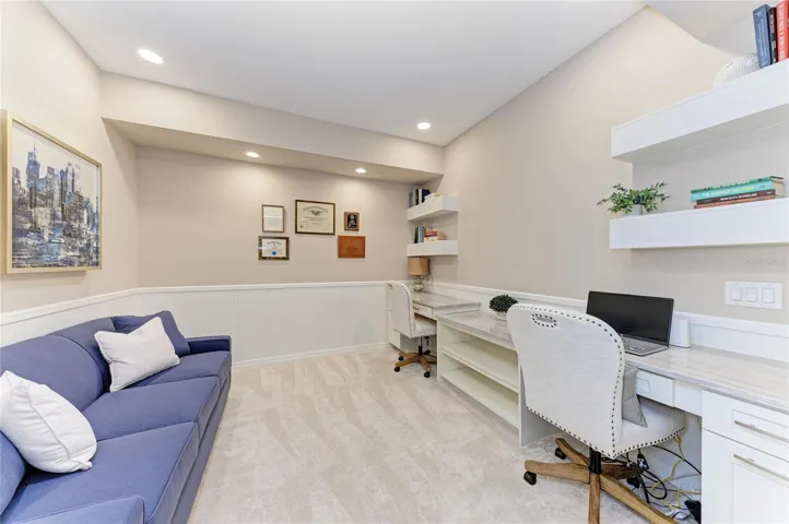 The primary suite continues the home’s ELEVATED DESIGN with a striking feature wall, custom ceiling detail, dual walk-in closets with built-in systems, and a spacious en-suite bath with dual sinks. The primary bedroom also impresses with a beautiful wood inlay accent wall. A thoughtfully designed office offers two built-in workstations, custom shelving, and a cozy sitting area, ideal for working or relaxing at home.