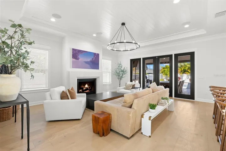 The first floor is exceptionally well appointed, offering a study, dining room, expansive great room with French doors leading to a covered lanai with retractable exterior screens, guest suite, gym / secondary office / flexible space, prep pantry, and mudroom. Custom pavers extend the outdoor living space, enhancing both functionality and visual appeal.