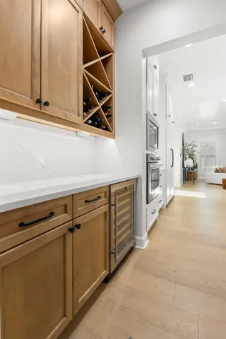 The heart of the home is a designer chef’s kitchen, featuring an expansive 11-foot island, apron-front sink, gas Fisher & Paykel appliance package, 36″ gas cooktop, built-in oven and microwave, double-drawer dishwasher, refrigerator and freezer towers, pot filler, custom soft-close cabinetry, walk-through pantry, and ambient LED under-cabinet lighting.