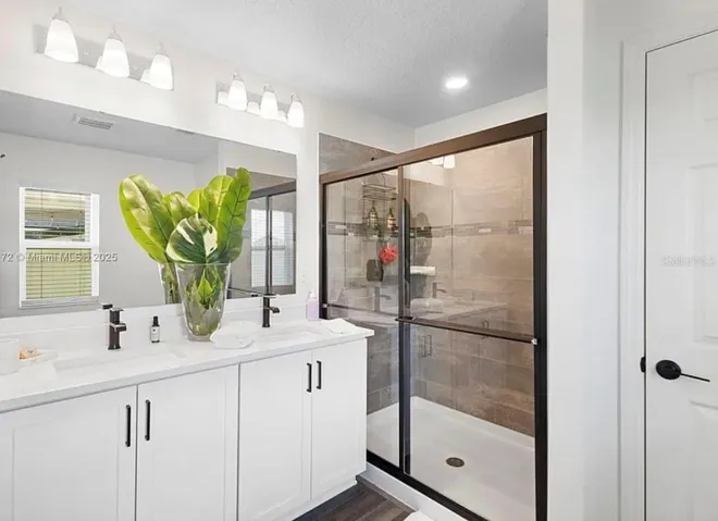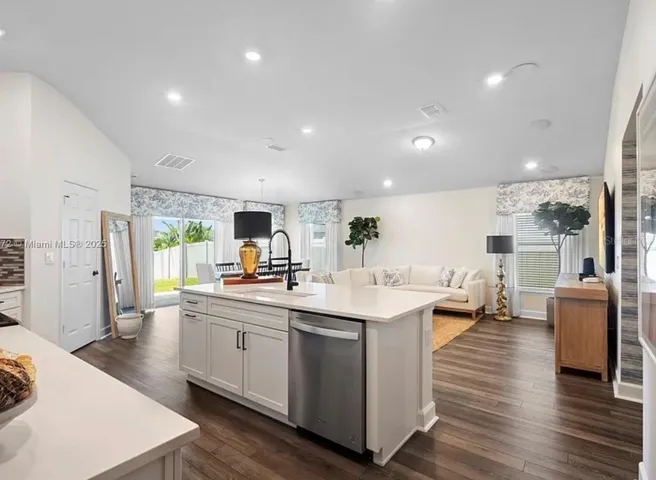 This stunning single-story home Like -new condition, barely lived in, features an attractive stone exterior and an open floor plan with plank flooring. Lots of upgradesThe spacious great room boasts high volume ceilings, creating an open atmosphere, while a dedicated laundry room offers convenient garage access. Upon entering, you’ll find two secondary bedrooms with designer wall paper, with generous closets and a full bath that includes a walk-in shower. The heart of the home is the chef’s kitchen, complete with an island, 36-inch upper cabinets, Silestone® countertops, a Moen® faucet, a Kohler® sink, and Whirlpool® stainless steel appliances. The primary suite serves as a relaxing retreat with a large walk-in closet and an ensuite bath featuring a dual-sink vanity and a walk-in shower with tile surround. Completing this home is a covered back patio, perfect for outdoor entertaining and leisure. Enjoy BellaVIVA’s amenities—sparkling pool, walking trails, and green spaces—all within a secure neighborhood just minutes from Disney, shopping, dining, and top-rated schools.