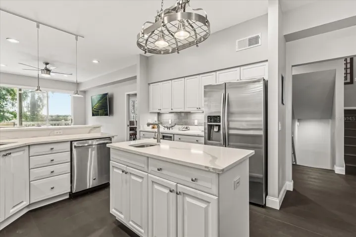 Water lovers, this one is for you! Imagine waking up to a breathtaking waterfront view & hopping into your boat to explore beautiful, expansive Lake Monroe & the St Johns River whenever you feel like it! Truly unique, this Key-West style beauty is front row to a natural paradise & just minutes to the plethora of Sanford’s & Lake Mary’s shopping and dining! This is located in a wonderful smaller gated community with an amazing waterfront complex including a resort-like pool, river-front lounge deck, cabana, playground & private boat docks. HOA fee includes lawn maintenance & your own private dock! Technically deeded as a condo, this is a detached single family home with the privacy, space & view that you’d expect. This remarkable home has had many recent renovations, including an updated kichen, baths, tankless hot water heater, interior paint, flooring & baseboards throughout! The elevated design of the home offers peace of mind as well as an incredible storage area underneath the living space at ground level for all of your fishing & watersports gear, including a huge 25 x 12 storage room! (not included in the square footage noted in the living space) Entering into the foyer, you’ll apreciate the soaring ceilings and floor-to-ceiling fireplace with panoramic views from the great room and dining room. The home features plantation shutters and stylish, luxury high-quality vinyl plank flooring throughout and has recently been completely repainted with a nuetral color throughout the interior. Preparing meals will be a delight with the captivating views from the gorgeous updated kitchen! The fully equipped kitchen has been recently been modernized and updates include new quartz counters, built-in wine fridge, both sinks, disposal, fixtures & hardware. The kitchen also features a built-in oven & convection oven, cooktop, preparation island with a veggie sink & a roomy breakfast bar with pendant lighting that opens to the comfortable living room. On the second floor, you’ll find two very generously-sized secondary bedrooms with large walk-in closets. The secondary bath includes a new shower, toilet, quatrz counter top, fixtures and flooring. Up the stairs on the third floor is the owner’s retreat. This sprawling primary has a private sitting room/work-out room. There are 3 walk-in closets for all your accoutrements, including an expansive one that features it’s own built-in desk. Relax in the spa-like primary bath including an all new walk-in shower with stylish lighting effects, multiple jets, quartz counters, dual sinks with new fixtures, flooring & a new toilet. The main highlight of this home is the spectacular area in the back! Spend your evenings winding down in the screened-in porch with summer kitchen overlooking the water. Beyond the porch is a massive deck with room for muliple seating areas. Off the deck, there are stairs leading down to a water-front seating area and an enormous secured storage area beneath the house. You’ll find the large unfinished storage room with enough space for anythng you might have & in a great location to cart things back and forth to the water. Other highlights of this home are upgraded wall insulation, all LED lights & natural gas. The community pool and ameneties are just steps away! Located just over the Lk Monroe bridge & just a mile walk from wonderful Gemini Springs State Park. A hub of 3 walking/biking trails converging are right outside the gates! Just 2.5 miles to the Debary Sunrail station!
