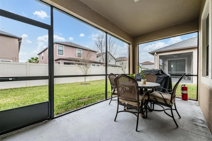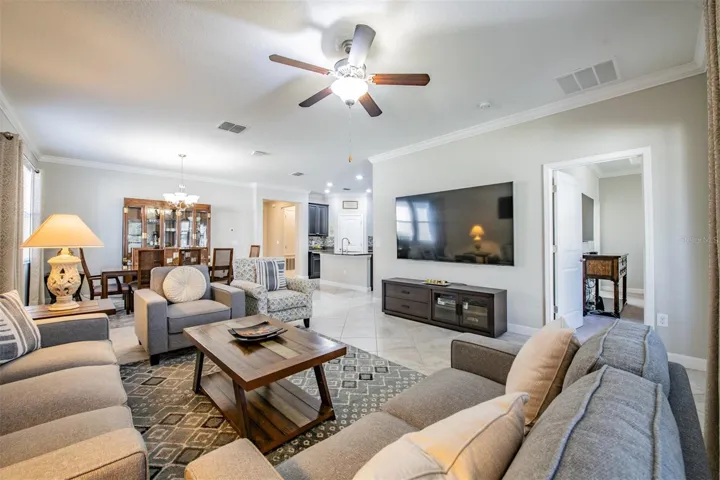 The gourmet kitchen is a true highlight, complete with granite countertops, updated backsplash, stainless steel appliances, and elegant cabinetry with crown molding. A large kitchen island with bar seating seamlessly flows into the living and dining spaces, making gatherings a breeze. The Living room opens to the covered screened in lanai, leading to a fenced backyard—ideal for outdoor relaxation.