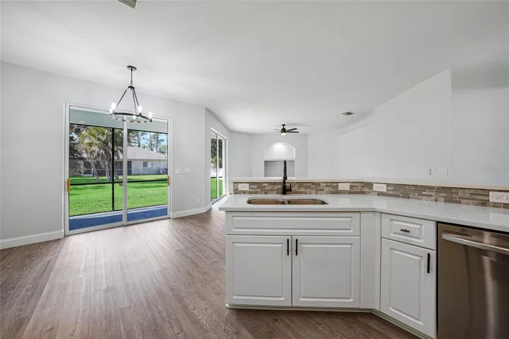 One or more photo(s) has been virtually staged. Welcome to this well-maintained 3-bedroom, 2-bathroom single-family home located in a quiet residential area of North Port. Built in 2005, this property offers 1,749 square feet of living space under air, plus a versatile den/office that can serve as a fourth bedroom or workspace. The home features a split floor plan with an open-concept living and dining area, high ceilings, and plenty of natural light. The spacious kitchen includes ample cabinet space, a breakfast bar, and direct access to the dining area — ideal for everyday living and entertaining. The primary suite offers a walk-in closet, dual sinks, and a separate tub and shower. Sliding glass doors from both the living area and primary bedroom open to a screened lanai overlooking the backyard, perfect for relaxing or outdoor dining. Additional features include a laundry room with washer and dryer, a two-car garage, and a well-sized lot with room for a future pool. Conveniently located near shopping, dining, schools, and I-75 for easy commuting.