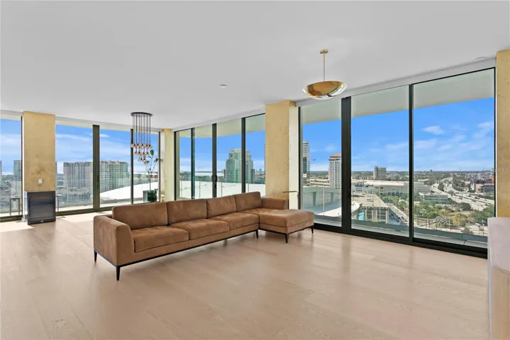 Floor-to-ceiling windows frame sweeping panoramic views of Tampa Bay and the downtown skyline, while sliding glass