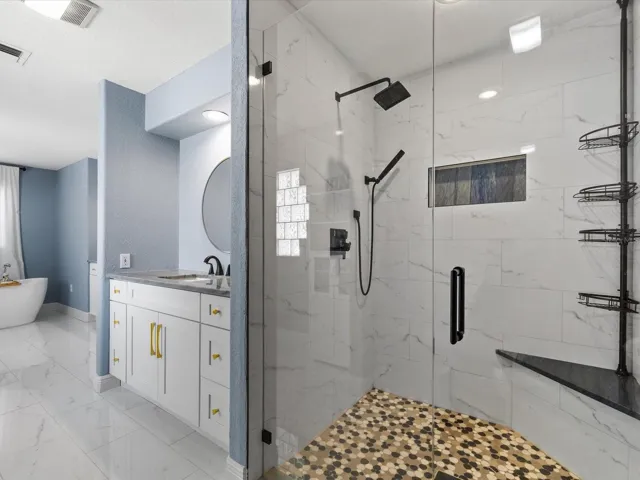 Inside, prepare to be impressed by the vaulted great room and open-concept layout. The stunning two-tone kitchen features solid wood cabinetry, a large center island, Azul Macauba stone countertops, custom backsplash, top-of-the-line appliances, and flows seamlessly into the living space anchored by a beautiful stone fireplace and built-in media wall. New wood laminate flooring, remodeled baths, and thoughtful finishes complete the home. Originally built to ADA-accessible standards, the layout offers ease and comfort throughout.