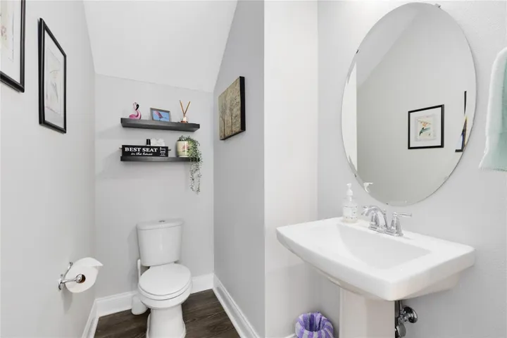The primary suite is privately positioned at the rear of the home and features high ceilings, exposed wood beams, plush carpet, and a serene atmosphere. The spa style primary bath offers dual vanities with granite countertops, dark hardware, designer lighting, and a striking floor to ceiling supershower with herringbone detail and built in seating. A spacious walk in closet with a custom designer closet system completes the suite, and all additional closets throughout the home have also been upgraded with custom storage solutions. A large laundry room with cabinetry, built in sink, and direct access to the primary bath adds everyday convenience. Upstairs, upgraded wrought iron stair spindles lead to a generous loft, perfect for a media or recreation space. One bedroom includes a private ensuite bath, while two additional bedrooms share a full bathroom, offering comfort and privacy for family or guests.