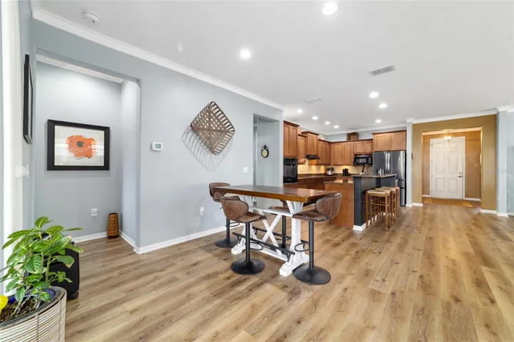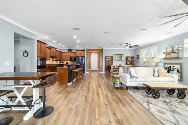 The gourmet kitchen is a focal point of the home and is equipped with a built-in oven, induction cooktop, rich staggered wood cabinets with crown molding, granite countertops, and a tile backsplash—perfect for both everyday living and entertaining. The open layout flows seamlessly into the main living areas, which feature wood-look LVP flooring, custom paint, crown molding, and rounded corners throughout. Plantation shutters add a polished, cohesive finish to the interior, and a whole-house generator provides added peace of mind.