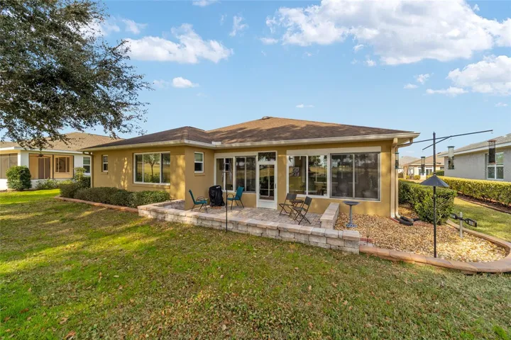 Outside, the home is enhanced by stone accents on the front elevation, an expanded paver driveway, a pavered front porch, and raised landscape beds. The rear of the home is a standout feature, with an enclosed lanai and pavered courtyard patio overlooking double fairway views of The Links golf course, creating an inviting space to relax and take in the scenery.