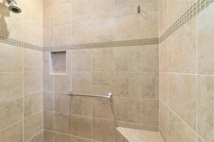 The primary suite offers a relaxing retreat with a walk-in closet and an en suite bathroom featuring split vanity sinks, granite countertops, and a tiled shower with frameless glass enclosure and built-in bench. The second bedroom is located on the opposite side of the home, ideal for guest privacy, while the second bathroom includes an upgraded tiled walk-in shower (no tub) and a vessel sink vanity.