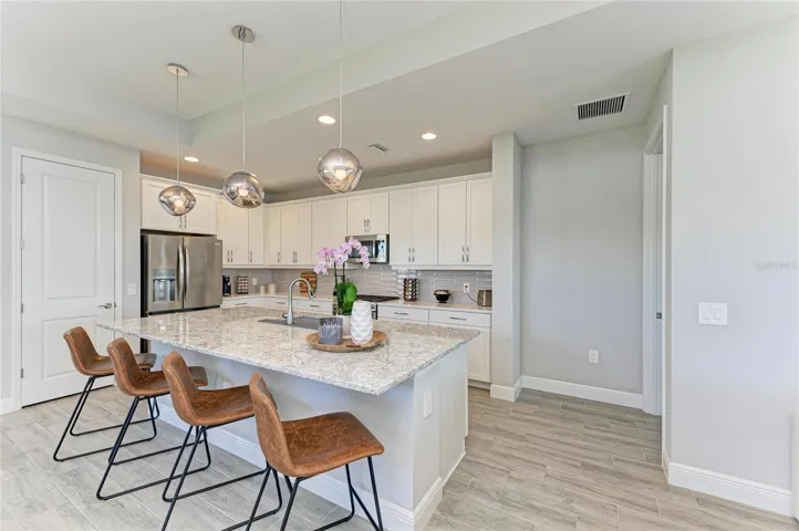 Set along the tranquil shores of Lake Ibis, this exceptional lakefront residence showcases spectacular, long, uninterrupted water views and breathtaking sunset vistas that define true Florida living. Built in 2022 by Homes by Towne, the Skiff floor plan offers thoughtful design, quality construction, and an enviable waterfront setting. Spanning 2,158 square feet, the home features three bedrooms, two full baths, a dedicated office/den, and an open-concept layout designed to maximize natural light while framing the stunning lake views from multiple living areas. The kitchen is both stylish and functional, featuring quartz countertops, custom cabinetry with soft-close drawers and pull-out shelving, under-cabinet lighting, stylish backsplash, and a layout ideal for everyday living or elaborate entertaining. The great room opens seamlessly to an extended lanai with a full-view screen enclosure, preserving clear sightlines across the water and front-row views of vibrant sunsets. The outdoor living area is a true highlight, offering a pool, separate standalone spa, generous covered seating area, an ideal setting for morning coffee overlooking the lake or evening gatherings as the sun sets aglow with color over the water. The owner’s suite is positioned to capture serene water views and glowing sunsets, creating a peaceful retreat complemented by a spa-inspired bath with dual quartz vanities, floor-to-ceiling tiled walk-in shower, and upgraded finishes. Two additional bedrooms and full bath on the other side of the home provide private flexibility for guests or family, while a light-filled office offers a quiet space for work or hobbies. Additional features include a large laundry room and a two-car garage with epoxy flooring and storage. Residents of LakeHouse Cove enjoy resort-style amenities, including a pool and spa, state of the art fitness center, clubhouse with catering kitchen, boathouse with kayak launches, pickleball courts, fire pits, dog parks, and a full calendar of social activities. Be as social as you want within this community. Conveniently located just minutes from Waterside Place, Lakewood Ranch Main Street, University Town Center, and downtown Sarasota, this exceptional residence offers effortless access to world-renowned beaches, celebrated cultural attractions, and Sarasota-Bradenton International Airport. A short journey opens the door to Florida’s iconic theme parks, adding yet another dimension to the lifestyle. This is a rare opportunity to enjoy spectacular lake views, unforgettable sunset vistas, and the peace of mind that comes with newer construction, all within one of Lakewood Ranch’s most sought-after communities.