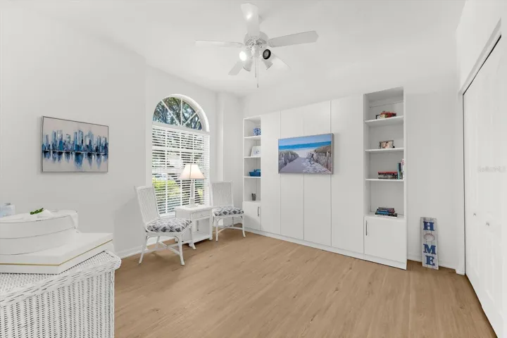 The second bedroom includes a Murphy bed, providing flexibility for guests, while the study/den easily adapts as a home office, guest space, or cozy reading nook.