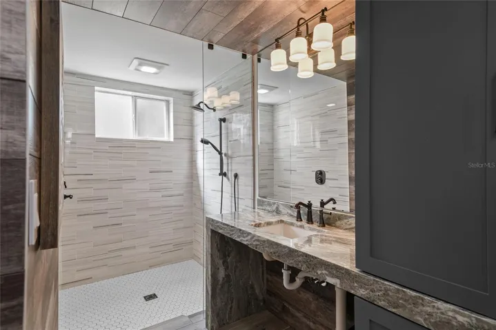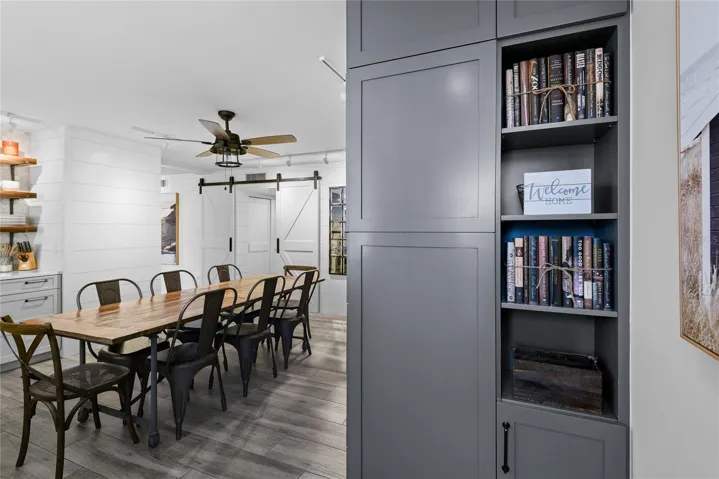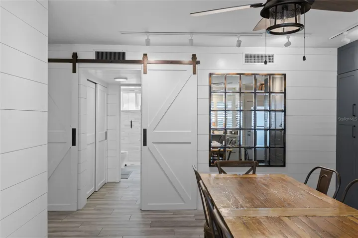 Bright and inviting, this one-of-a-kind unit features custom cabinetry and lighting, shiplap walls, tongue-and-groove ceilings, wood-grain ceramic tile flooring, and bespoke window treatments throughout. The primary suite includes an ensuite bathroom with a roll-in shower and floating vanity. The gourmet eat-in kitchen comfortably seats eight and boasts a walk-in pantry and built-in appliances. Prewired for Smart-Home technology, this home allows for effortless voice activated control of the AC, lighting, TV, music, and front door locks. A dedicated laundry area completes the thoughtful design.