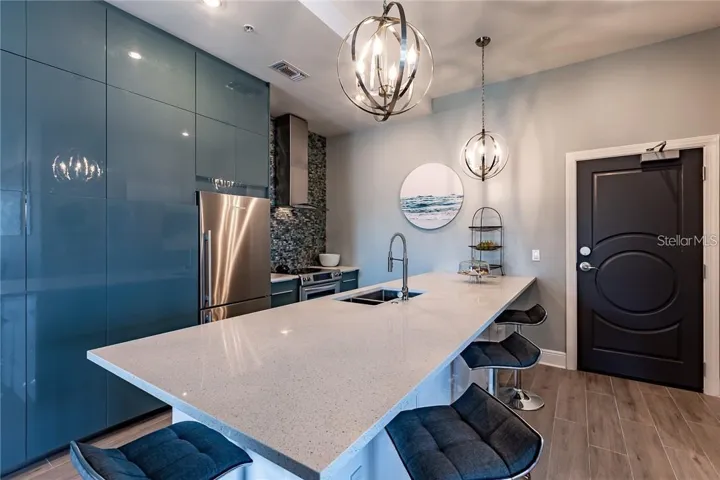 kitchen that boasts Quartz countertops, a Bosch dishwasher, Blomberg refrigerator, Crane sink, and custom-built storage solutions. Enjoy the