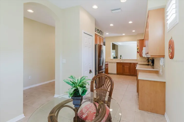 Entertain effortlessly in the large dining room, accented by tray ceilings and recessed lighting with a dimmer switch. Modern upgrades include newer storm-impact windows and sliding glass door for peace of mind, a 2024 A/C system with UV light, whole-house water filtration system, water softener, plantation shutters, and a 2020 roof that meets all requirements for full insurance discounts. Additional features encompass gutters with an extra downspout and neighbor divider, plus a 2-car garage with a hurricane-rated door and plenty of cabinets for storage.