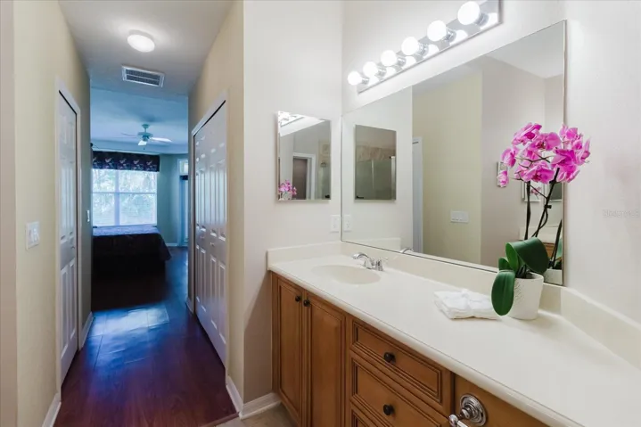 The luxurious primary suite offers breathtaking conservation views and direct access to the lanai. Its en-suite bath includes dual sinks, a newer rain glass shower door, and newer tiled shower, complemented by two large closets, one walk in. The generous second bedroom also enjoys conservation views, while the second bath features rain glass tub doors. Convenience abounds in the laundry room with a full-size washer and dryer, sink, and space for hanging clothes.