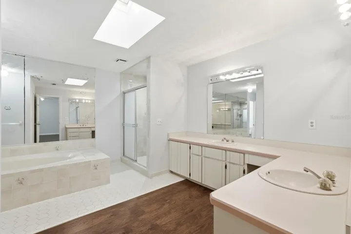 The home features multiple living areas designed for flexibility, including a large living room with a fireplace and a separate family room accented by cypress wood walls and built-in shelving. Hardwood parquet flooring runs through the foyer, kitchen, and dining area, connecting the main living spaces with a warm, cohesive feel. The kitchen, dining area, half bath, and screened patio are all located on the main level, creating an easy, functional layout.