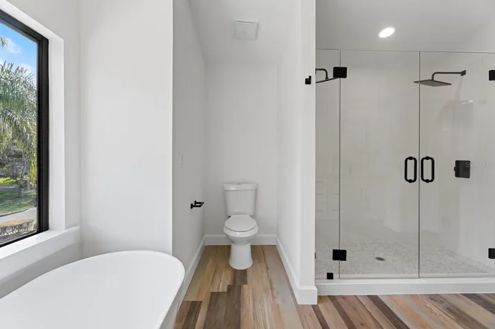 The entire second floor functions as a private primary suite, featuring an en suite bathroom with a soaking tub beneath the window, a double steam shower with glass doors, and access to a newly rebuilt balcony.