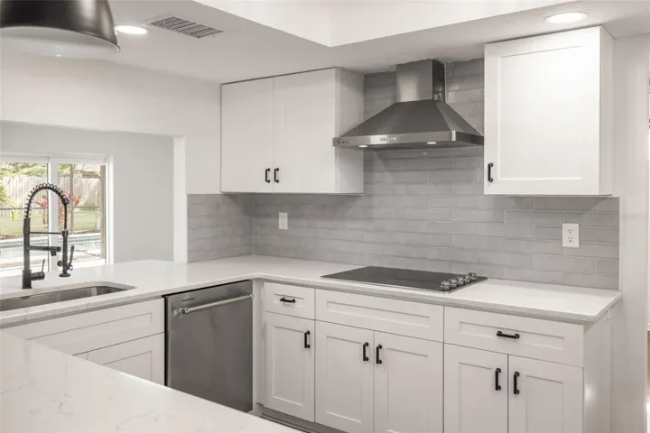 The heart of the home is the stunning kitchen with quartz countertops, white shaker cabinetry, stainless steel appliances, a breakfast bar, and a stylish built-in bar area complete with mini fridge and custom cabinetry—ideal for entertaining.