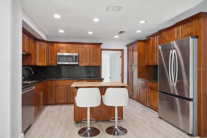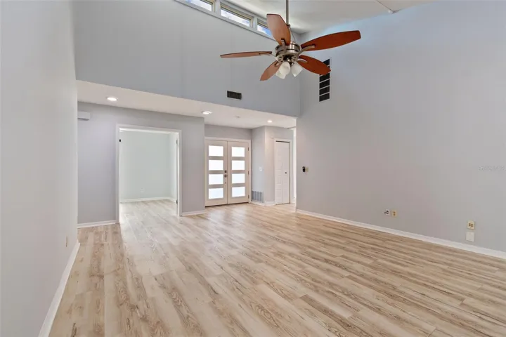 Both primary suites overlook the private, solar-heated screened pool, while the guest bathroom has been fully updated. Additional upgrades include all new windows and doors throughout, luxury vinyl flooring in the bedrooms, and a newer HVAC system.