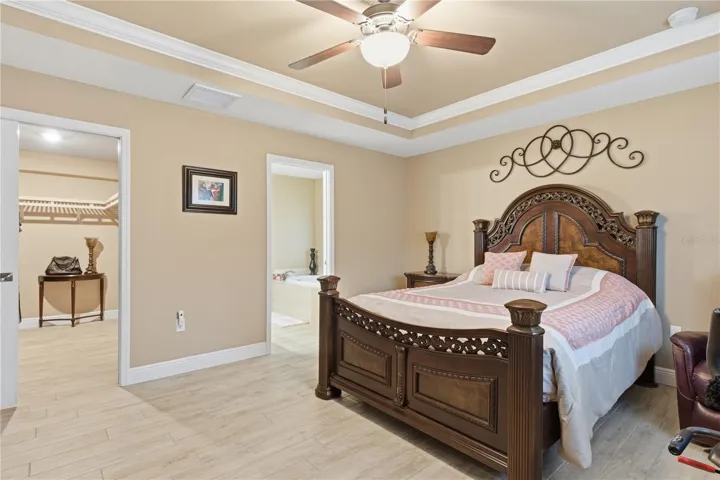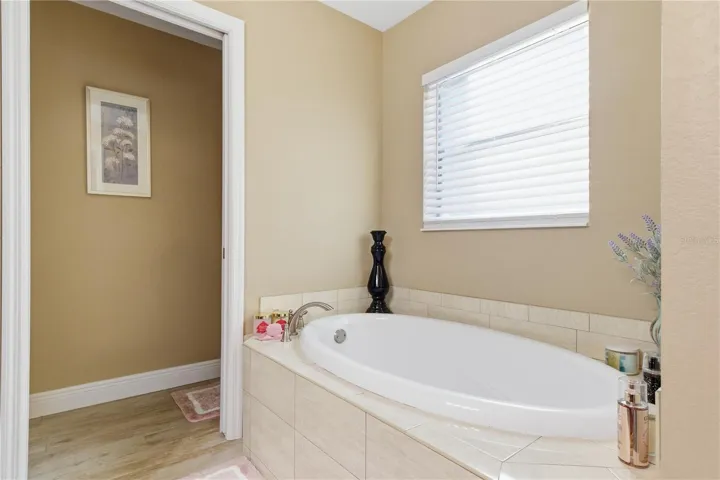 Beautifully maintained 4-year-old Windemere home featuring a well-designed open floor plan with wood-plank tile flooring throughout. The spacious primary suite offers a tray ceiling, walk-in closet, and a private en-suite bathroom with dual sinks, soaking tub, and separate shower. The guest bedroom is conveniently located near the second full bathroom with a walk-in shower.