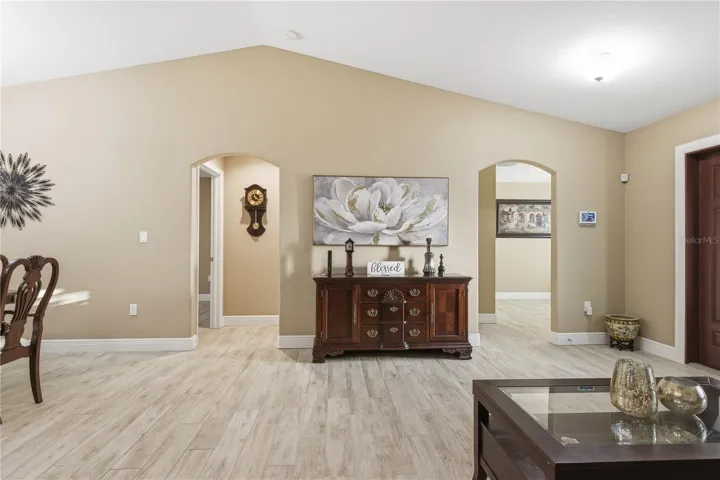 A versatile den/entertainment room provides additional living space, while the mudroom/home office offers flexibility for remote work or organization. The open kitchen features solid wood cabinetry, quartz countertops, stainless steel appliances, and a functional layout ideal for everyday living and entertaining. Quartz countertops continue in the bathrooms, creating a cohesive and modern finish. Bright, connected living and dining areas provide a comfortable and natural flow throughout the home.