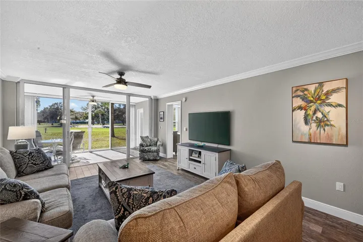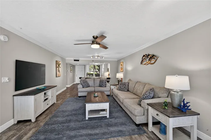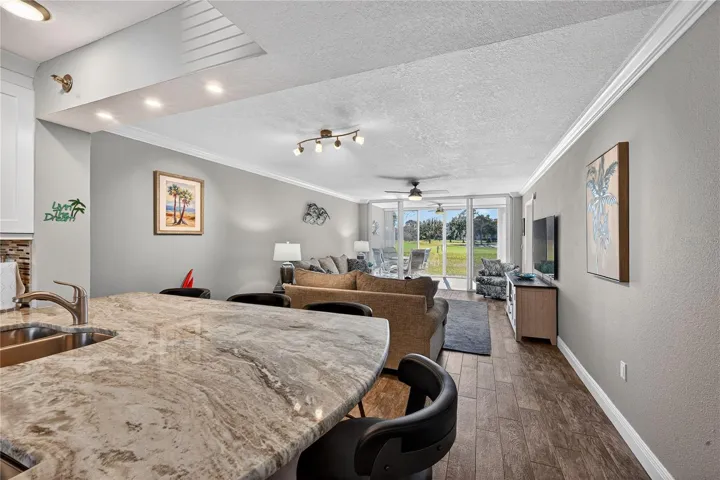The open great room features wood-look porcelain tile throughout, modern textured ceilings,