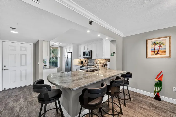 crown molding, and abundant LED lighting. The redesigned kitchen is a standout, featuring ceiling-