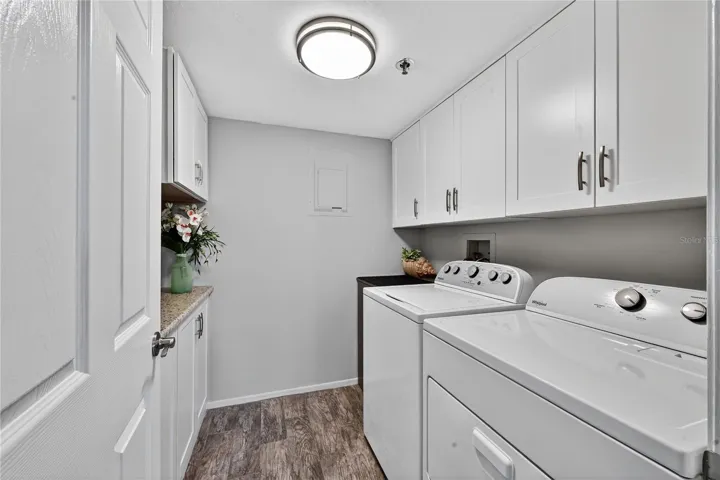 thoughtfully designed laundry area features custom cabinetry, granite countertop workspace, and