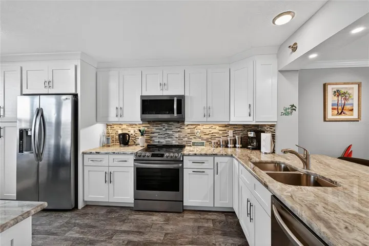 tiled backsplash, under-cabinet lighting, and a spacious bar seating area ideal for casual dining