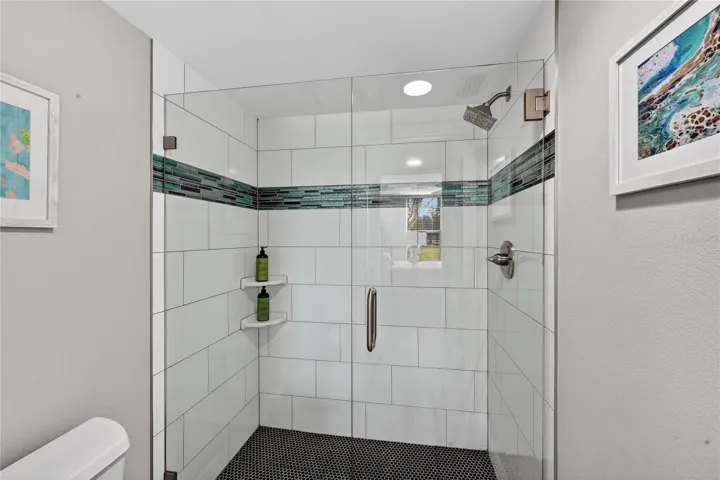 nickel fixtures, chair-height toilets, and a custom tiled walk-in shower with frameless glass in the