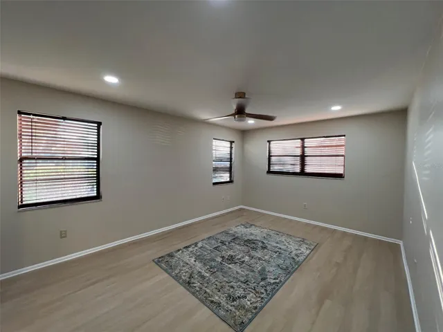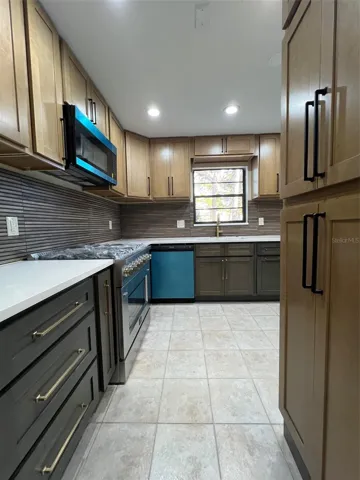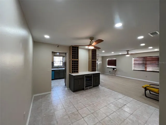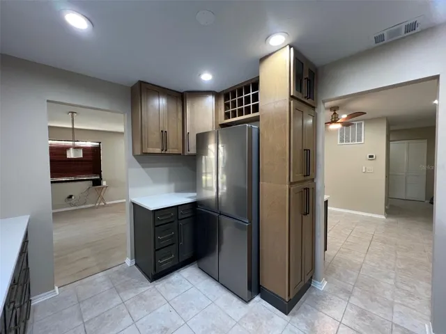 Renovated in December 2025; new luxury vinyl flooring, new shaker kitchen cabinets, laundry room, all new recessed ceiling lights, new dining room & living room lights, all new ceiling fans, freshly painted walls, doors, trim & ceilings; all new bathroom vanities & faucets, new vanity lights; all new stainless steel appliances; new kitchen faucets, new Quarts countertop; new tub & shower trim in both bathrooms; new bathroom mirrors; bar area with plenty of wine racks, new wine cooler, living has new wood look tile wall; kitchen backsplash has the same wood look tiles. Waterfront ground floor two bedroom. Parking space 68, next to the front door. Screened enclosure overlooks the lake – water. Two full bathrooms. Primary bathroom features a step-in shower. Five Towns is an active 55+ community and offers six swimming pools, athletic courts for tennis, pickleball, bocce, and shuffleboard, several patios & picnic areas, 2 clubhouses with libraries, fitness centers, billiards rooms, and card rooms. Explore the variety of cultural attractions nearby including the Salvador Dali Museum, Palladium Theatre, and St. Petersburg Museum of Fine Arts. Located close to shopping, restaurants, beaches, golf and 25 minutes to the airport. Staging furniture (including electric fireplace) not included in sale. Current 36-inch gas stove is not included; similar 36-inch gas stove will be provided prior to closing.