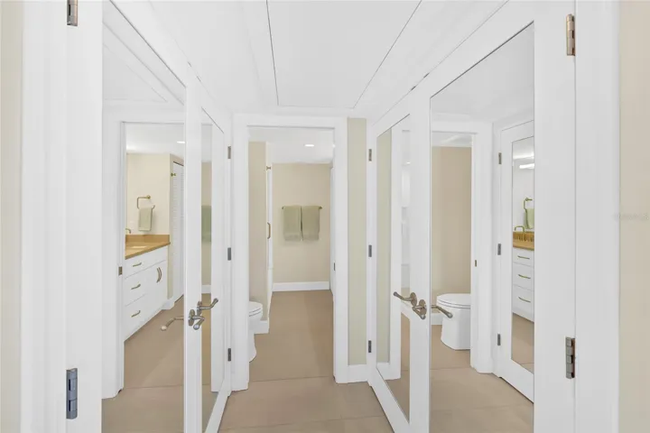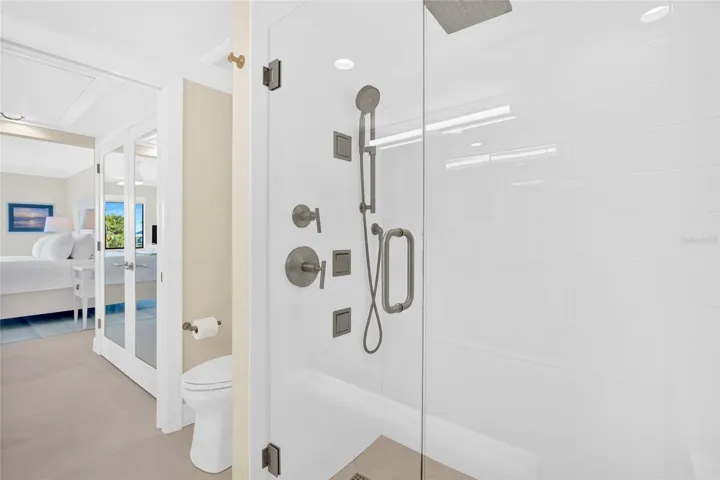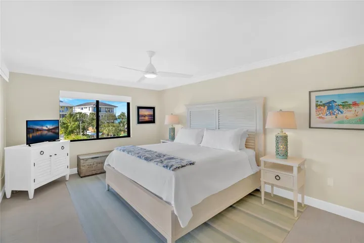 The residence has been remodeled wall to wall and floor to ceiling since 2020, with thoughtful attention to both design and infrastructure. The open floor plan blends the kitchen, dining, and living areas seamlessly, allowing water views to take center stage from nearly every angle. Porcelain tile flooring runs throughout the entire unit, creating a clean, cohesive look that complements the seaside setting. The kitchen features shaker-style Providence White cabinetry with glass-front display cabinets and interior lighting, a pantry with pull-out shelving, Pompeii Quartz countertops, a Glazzio tile backsplash, and updated appliances including refrigerator, range, dishwasher, built-in microwave, washer, dryer, and HVAC system. The primary suite, perched above Blind Pass, is a serene retreat with crown molding, solid core doors, and custom closet systems with mirrored panels. The ensuite bath offers dual vanities topped with Pompeii Quartz, a walk-in shower with glass enclosure, tiled bench, multiple body jets, subway tile walls, and subtle motion-sensor lighting. The guest suite, with views of the ICW, features a barn door entry and a bath with cast-iron tub and quartz-topped vanity. A screened lanai extends the living space outdoors with porcelain tile flooring, a tongue-and-groove ceiling, new screens and railings, and tranquil water views that invite morning coffee or evening relaxation. Additional features include recessed lighting throughout, ceiling fans, a woven dining area chandelier, sheer and room-darkening solar shades, Schlage door lock, Ring doorbell, and Nest thermostat. Castaway Cove is a low-density community of just eight residences offering ample parking, professional management, and exceptionally low association fees. Recent community improvements include a new seawall, refreshed landscaping, updated exterior lighting and irrigation system, and a freshly painted building. The two-story structure is NOT subject to a Milestone Inspection. Furnishings may be available for a truly turnkey opportunity.