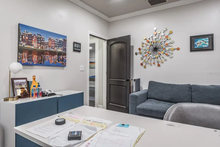 Well-appointed office space in the heart of St. Petersburg, offering a modern and boutique style for a variety of uses. This versatile property features 5 private office suites – 2 large enough for 2 desks each- a welcoming reception area, and a newly updated kitchen for staff convenience. The space includes 1 full bathroom and 1 half bathroom, providing comfort and efficiency for employees and clients alike.