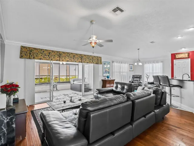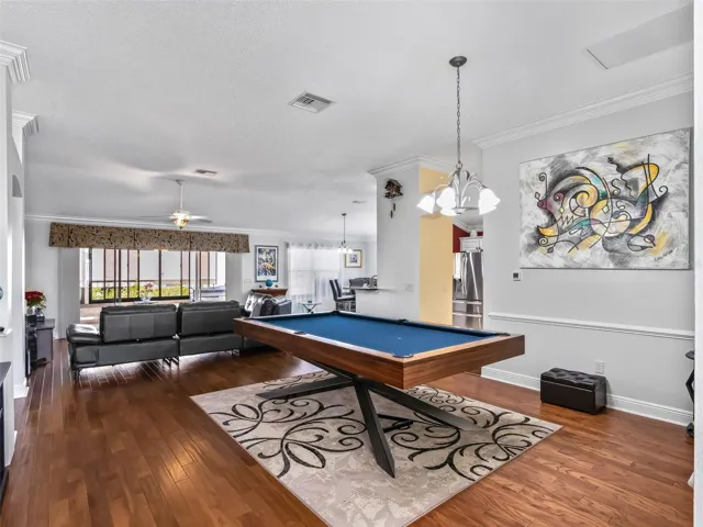 This 3-bedroom, 2-bath home features volume ceilings, beautiful crown molding, wood floors in the living and dining areas, and an open layout designed for comfort and entertaining. A standout bonus: the pool table that converts into a dining table conveys with the home!