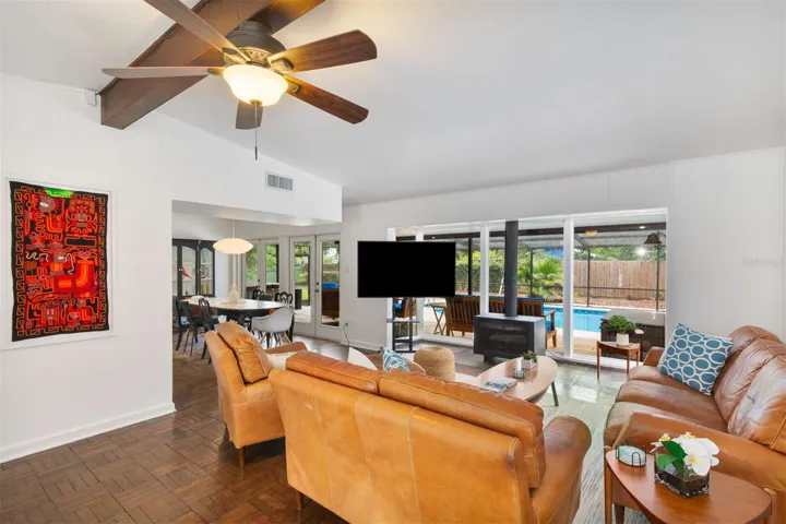 Directly across the street from the UF Golf Course, this move-in-ready 4-bedroom, 3-bath mid-century modern home offers a combination of location, flexibility, and amenities that is hard to match this close to campus. Situated on 1/3 of an acre, the home features parquet flooring, updated bathrooms, and a flexible layout with a private in-law suite and separate entrance—ideal for Gator parents, multi-generational living, or offsetting costs by renting part of the home. The remainder of the house can easily function as a primary residence, game-day retreat, or high-demand rental. Outdoor living truly sets this property apart, with a screened-in pool and hot tub, covered patio, and a large fenced backyard—perfect for entertaining, relaxing, or hosting game-day gatherings. Built-in covered parking and ample additional parking are a major advantage in this prime location, including game-day parking potential. Walk or bike to UF Law School, the stadium, O’Connell Center, Publix, dining, and shopping. Currently operating as an established Airbnb, this property offers immediate income potential or the option to move right in.