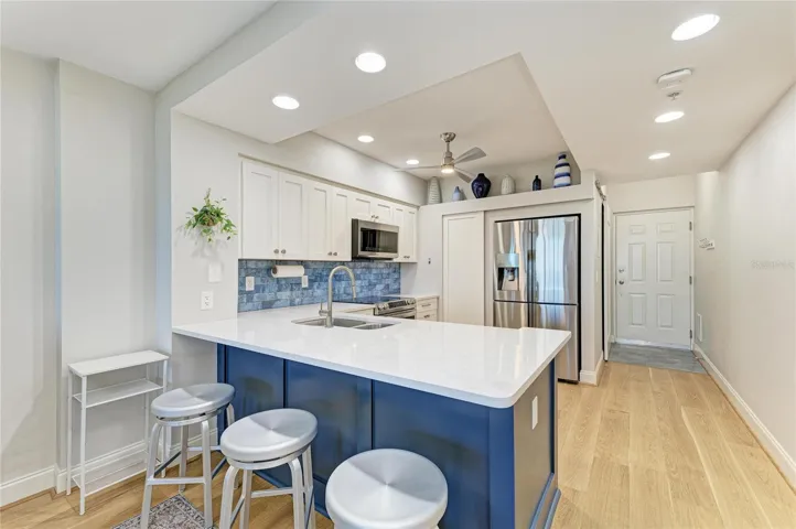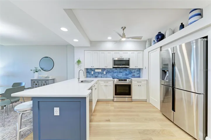 The kitchen feels welcoming and easy, showcasing a fresh two-tone palette of white upper cabinets and rich dark-blue lowers, eye-catching quartzite countertops, a bold backsplash, and newer stainless appliances. The breakfast bar is made for quick bites, morning coffee, and easy conversation, while the open layout keeps everything connected — so whoever’s cooking never misses the views or the fun.