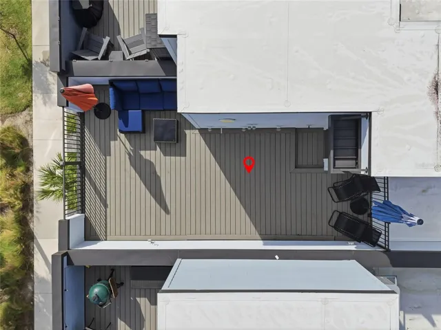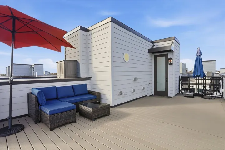 The third level offers a comfortable and private bedroom retreat with a spacious primary suite featuring dual vanities, a secondary bedroom, and a full bath. At the top level, the home truly shines with an expansive rooftop terrace finished with Trex decking and pre-plumbed for a summer kitchen, fireplace, and hot tub. The rooftop umbrellas are included, creating a cozy and inviting outdoor space to relax, entertain, and enjoy beautiful skyline views.