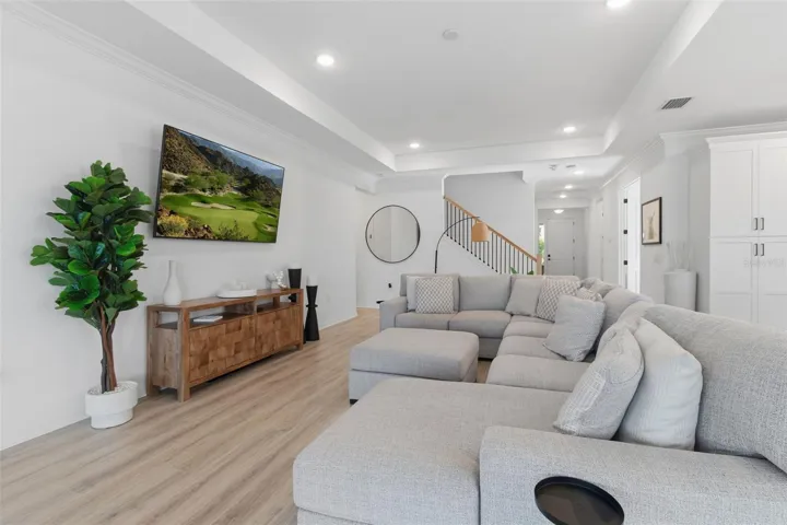 At the heart of the home, the chef’s kitchen is appointed with Cambria quartz countertops, a generous center island, a walk-in pantry, and a GE Café smart appliance suite, including a built-in Keurig coffee system. Seamless flow into the living and dining areas creates an inviting setting for gatherings of any scale.