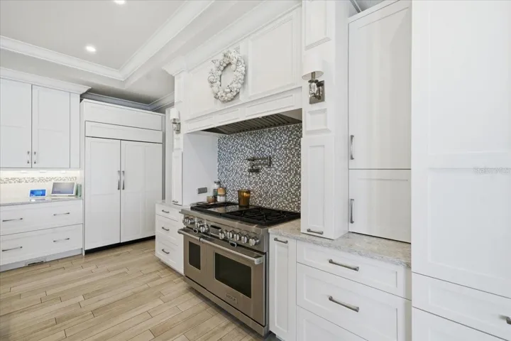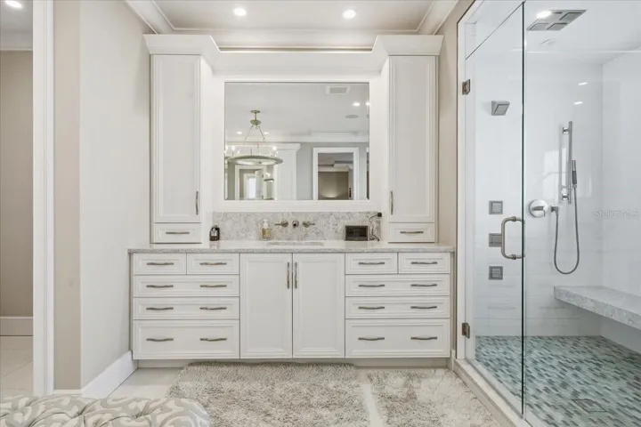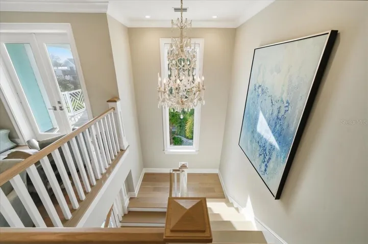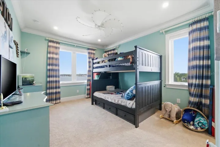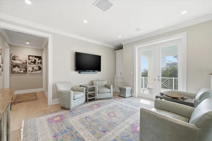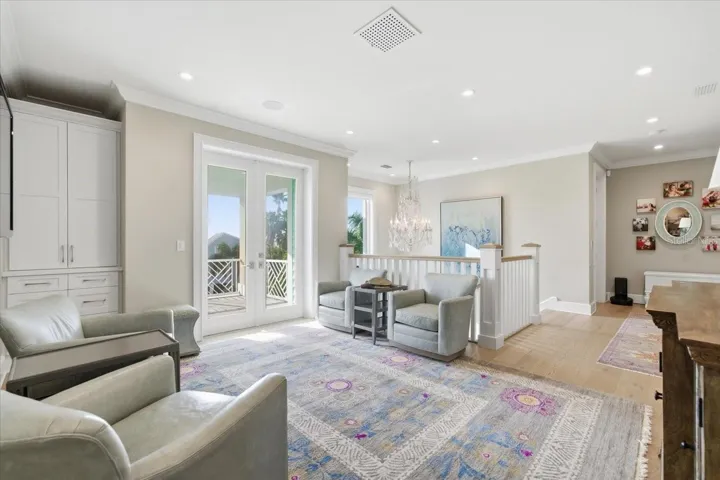 The primary suite is a true retreat, featuring a fireplace, private sitting area, expansive walk-in closet accented by a Swarovski chandelier, and a spa-inspired en-suite bath with soaking tub, oversized shower, and private balcony. With seven covered balconies, en-suite baths for every bedroom, two laundry rooms, a dedicated office, and a 3+ car garage, every detail has been thoughtfully designed to elevate the waterfront lifestyle.