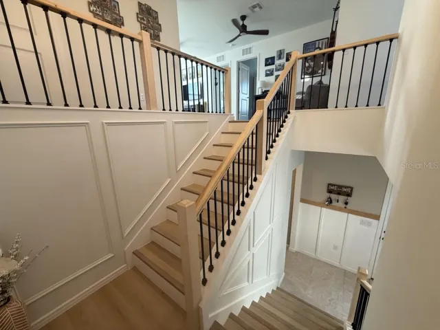 Situated on a pie-shaped lot backing to a conservation area, the property provides rare privacy and a peaceful natural backdrop. Inside, abundant natural light fills the home, highlighting an open, airy floor plan anchored by a striking open staircase and a custom fireplace TV wall that serves as the focal point of the main living space.